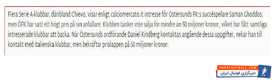 «چند باشگاه ایتالیایی از جمله کیه وو ورونا پیشنهادات رسمی برای خرید سامان قدوس به اوسترسوند ارسال کرده است که با واکنش هایی از سوی سران این باشگاه روبرو شد. گویا اوسترسوند در پاسخ به این پیشنهاد اعلام کرده به هیچ عنوان اجازه جدایی به مهاجم ایرانی خود با پیشنهاد کمتر از ۵۰ میلیون کرون را نخواهد داد».