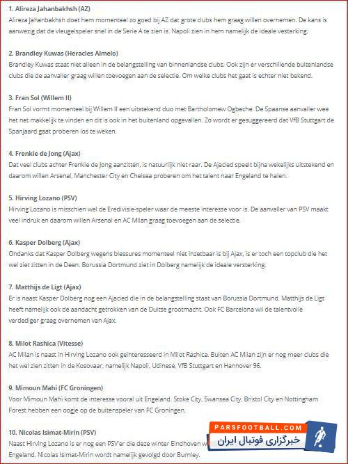در فهرست ۱۰ گزینه اصلی نقل و انتقالات آردیویسه از دید این سایت هلندی نام ستاره ایرانی آلکمار به چشم می خورد:
