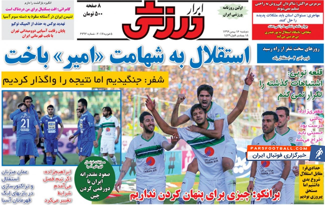 روزنامه ابرار ورزشی ، دوشنبه ۱۶ بهمن ؛ استقلال به شهامت امیر باخت !