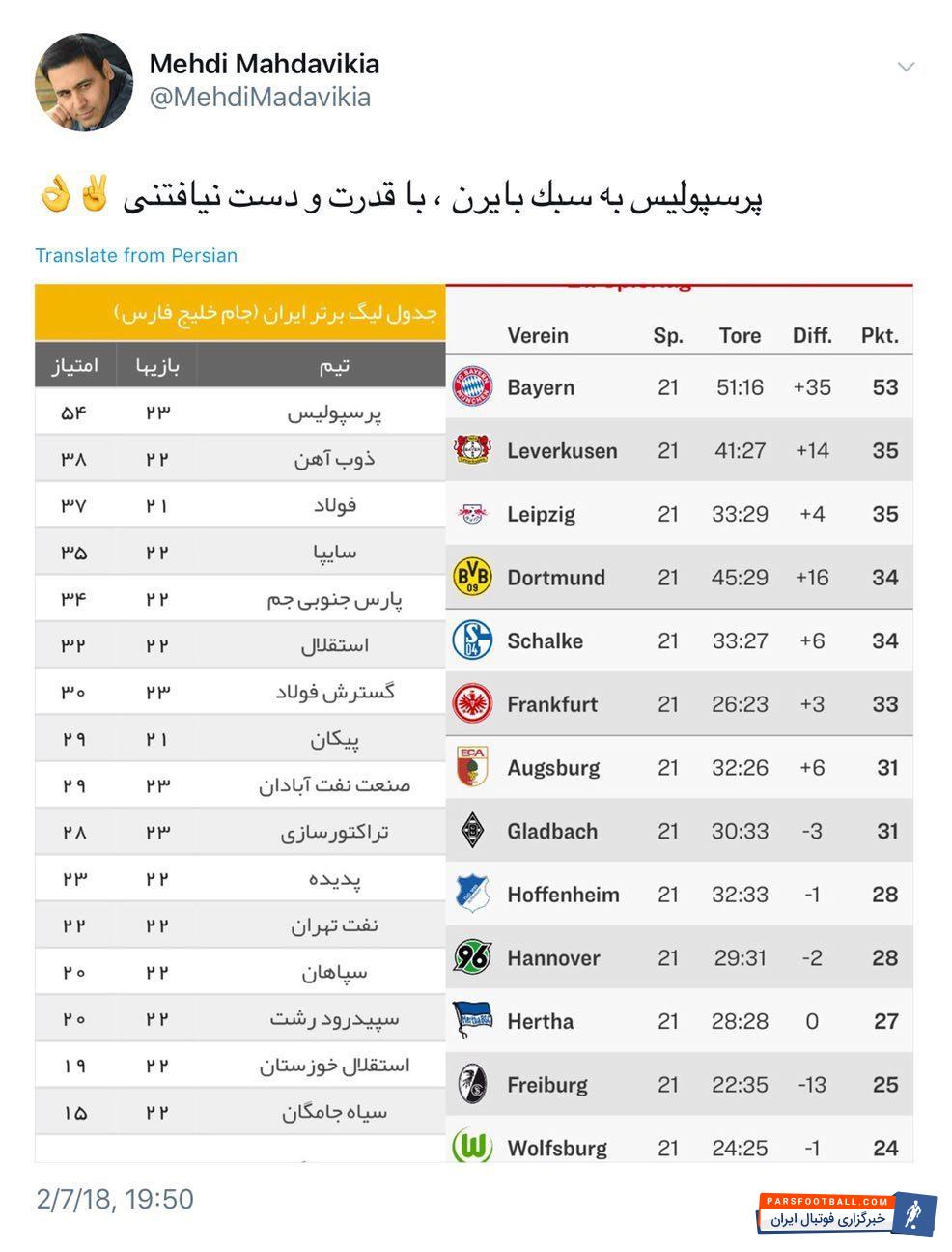 امروز (چهارشنبه) شاگردان برانکو در دیدار هفته ۲۳ ام رقابت های لیگ برتر مهمان صنعت نفت آبادان بودند و با نتیجه ی ۳ – ۰ از سد میزبان گذشتند.پرسپولیسی ها هم اکنون با انجام ۲۳ بازی ، کسب ۵۴ امتیاز و تفاوت ۱۶ امتیازی نسبت به شاگردان ژنرال در تیم ذوب آهن که در رده ی دوم جدول قراردارند ، مقتدرانه صدرنشین جدول هستند .مهدوی‌ کیا با انتشار تصاویر جداول رده‌بندی بوندس‌لیگا و لیگ برتر فوتبال ایران نوشت: