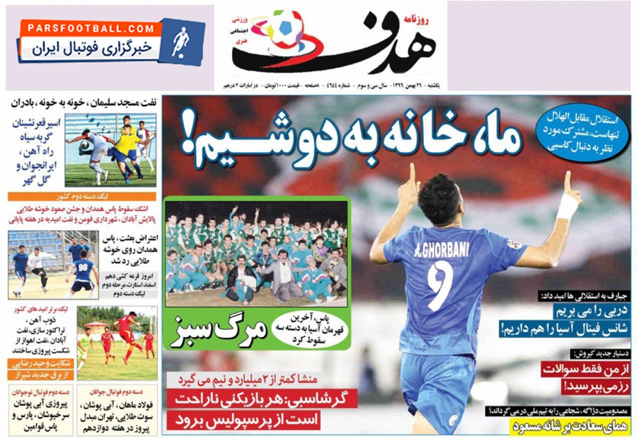 روزنامه هدف ورزشی ، یکشنبه ۲۹ بهمن ؛ دربی را می بریم ، شانس فینال آسیا را هم داریم !