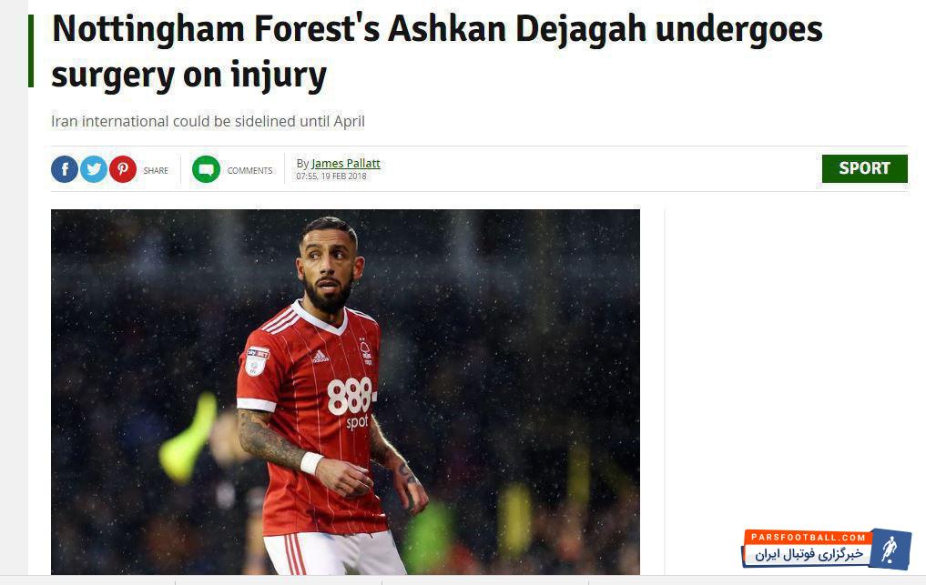 « بعد از تنها چند هفته از امضای قرارداد با ناتینگهام فارست، اشکان دژاگه به دلیل آسیب دیدگی از ناحیه رباط داخلی برای دوماه از میادین دور ماند. نکته تاسف بار این است که ستاره ایرانی باید عمل جراحی روی پای خود با نظارت کامل باشگاه و کادرپزشکی داشته باشد تا در کمترین فاصله زمانی مجوز بازگشت به میادین را دریافت کند».