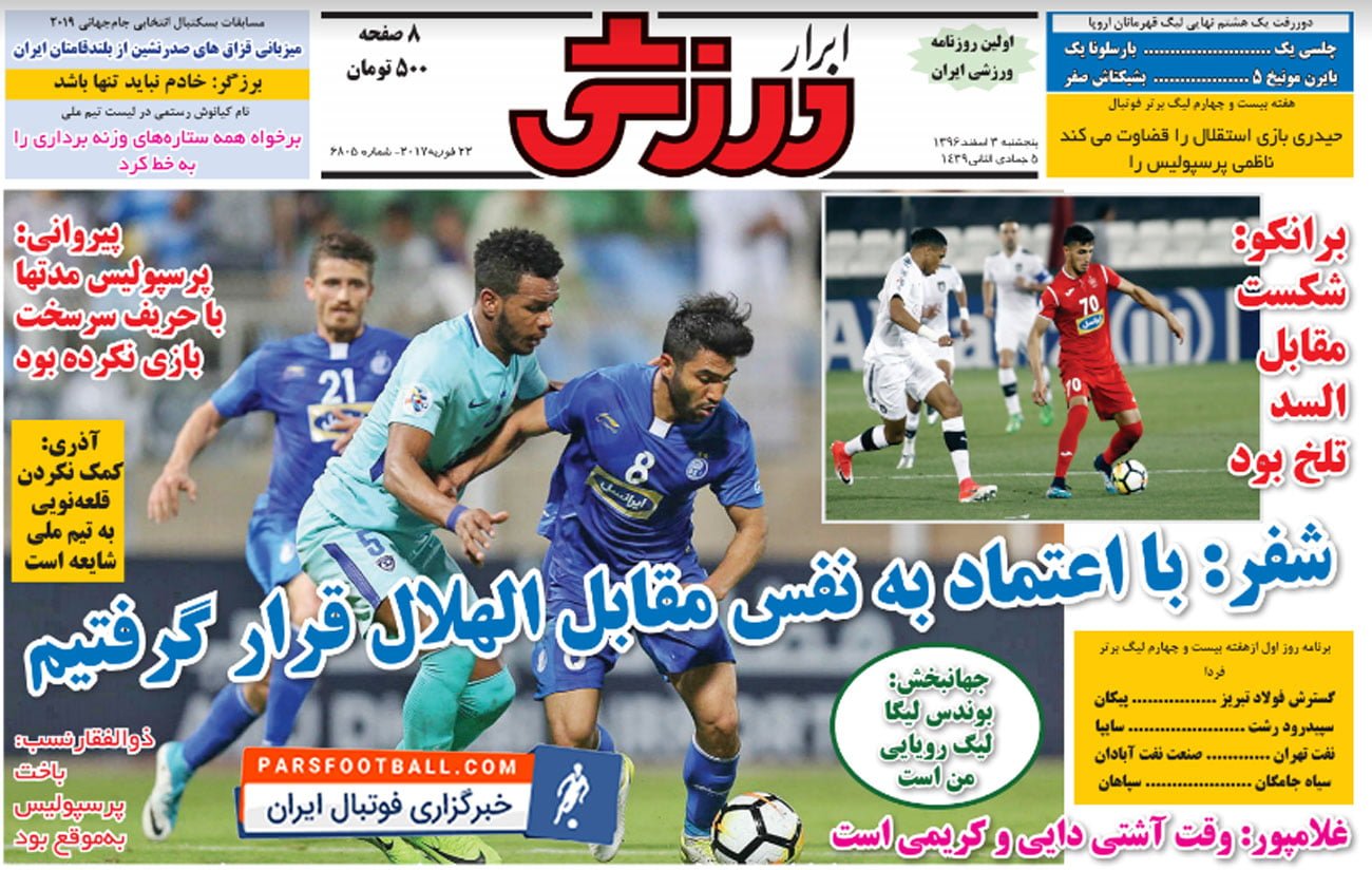 روزنامه ابرار ورزشی ، پنجشنبه ۳ اسفند ؛ شکست مقابل السد تلخ بود !