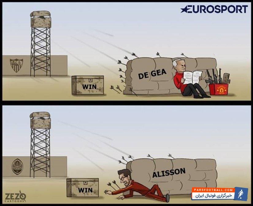 دور رفت مرحله یک هشتم نهایی لیگ قهرمانان اروپا شب گذشته با برگزاری دو دیدار دیگر به پایان رسید. در این بازیها منچستریونایتد در شب درخشش خیره کننده داوید دخیا از شکست برابر سویا گریخت و بایک تساوی بدون گل، سانچز پیسخوان را ترک کرد. در دیگر بازی نیز رم در هوای سرد اوکراین با درخشش آلیسون بکر، از تحمل شکستی سنگینتر از ۲-۱ دوری کرد تا همچنان برای صعود به جمع هشت تیم برتر شانس داشته باشد. اتفاقات این دو بازی که عرصه درخشش دو دروازهبان بود، به دستمایه زیزو الیزیدی تبدیل شده تا کاریکاتور زیر را برای یورو اسپورت به تصویر بکشد: