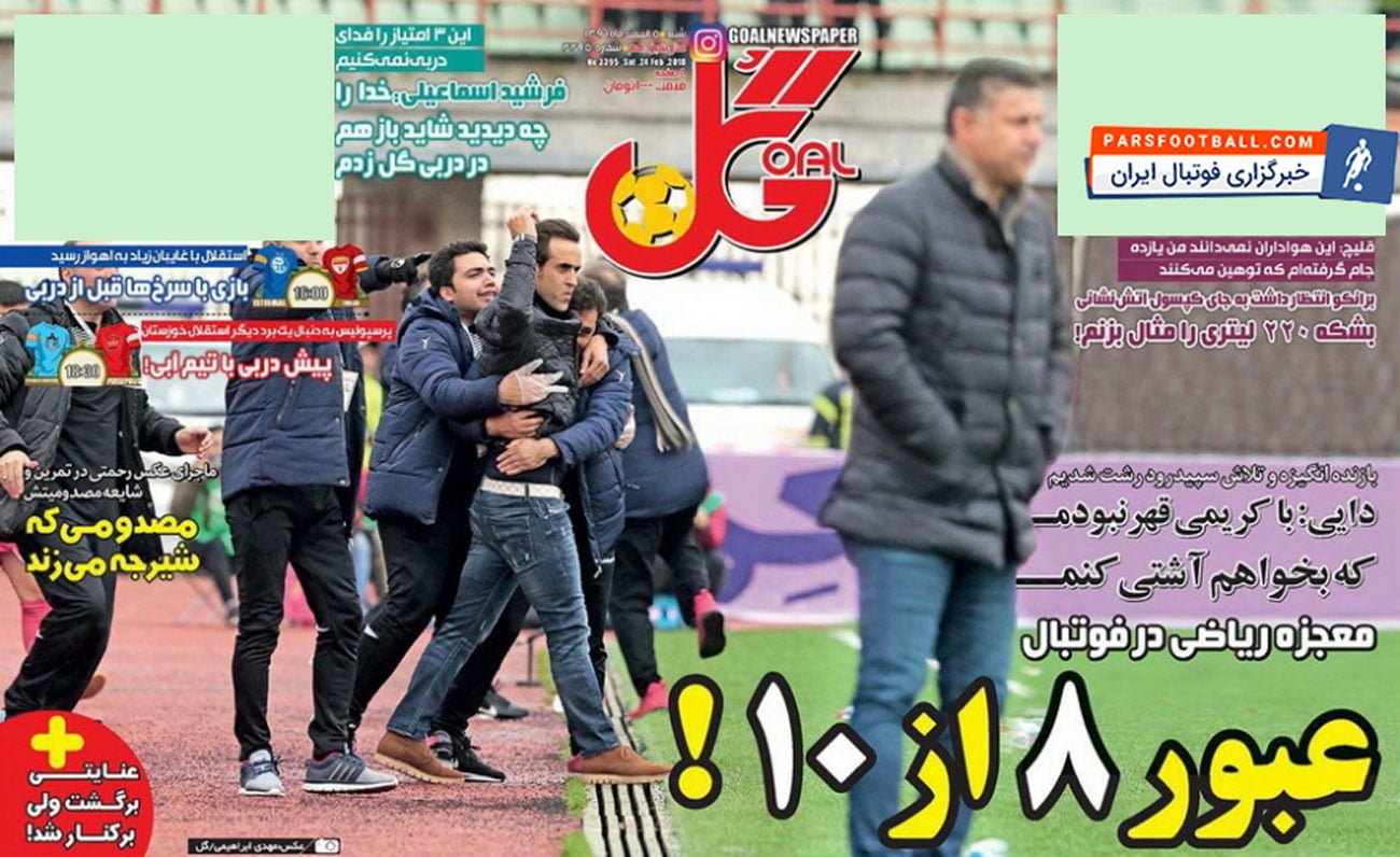 روزنامه گل ، شنبه ۵ اسفند ؛ معجزه ریاضی در فوتبال : عبور ۸ از ۱۰ !