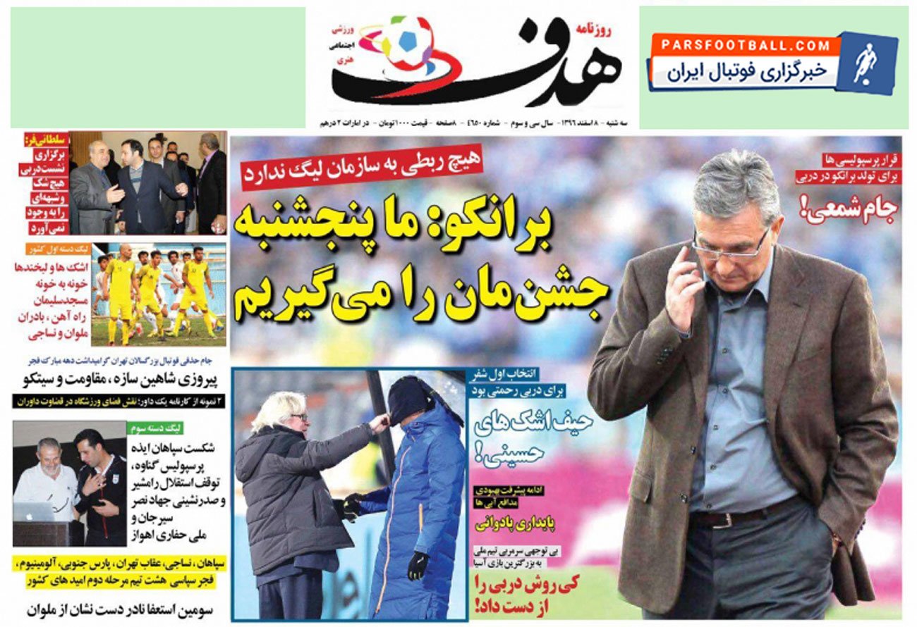 روزنامه هدف ورزشی ، سهشنبه ۸ اسفند ؛ ما پنجشنبه جشن مان را می گیریم !