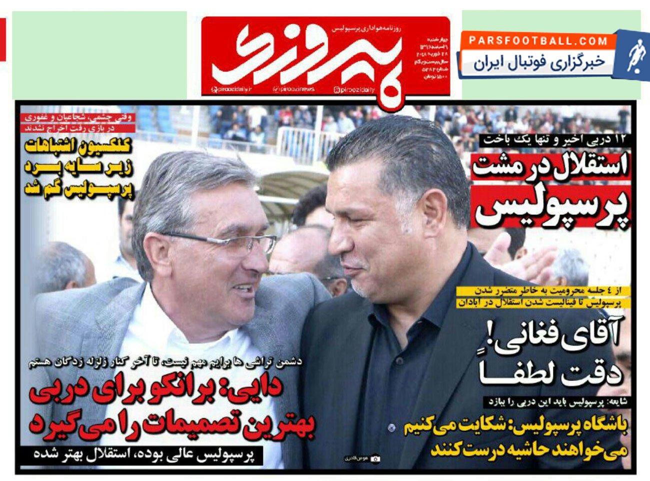 روزنامه پیروزی ، چهارشنبه ۹ اسفند ؛ استقلال در مشت پرسپولیس !
