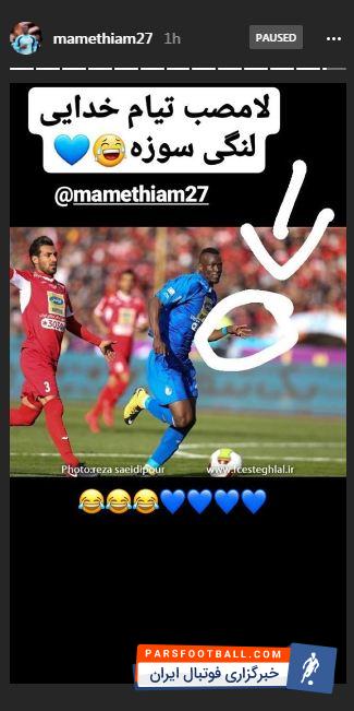 تیم فوتبال استقلال تهران در روز پنجشنبه ۱۰ اسفند موفق شد پرسپولیس تهران را شکست دهد، مامه بابا تیام که تنها مهاجم استقلال تهران بود و در گل این تیم تاثیر به سزایی داشت، در اینستاگرام خود واکنش جالبی انجام داد.