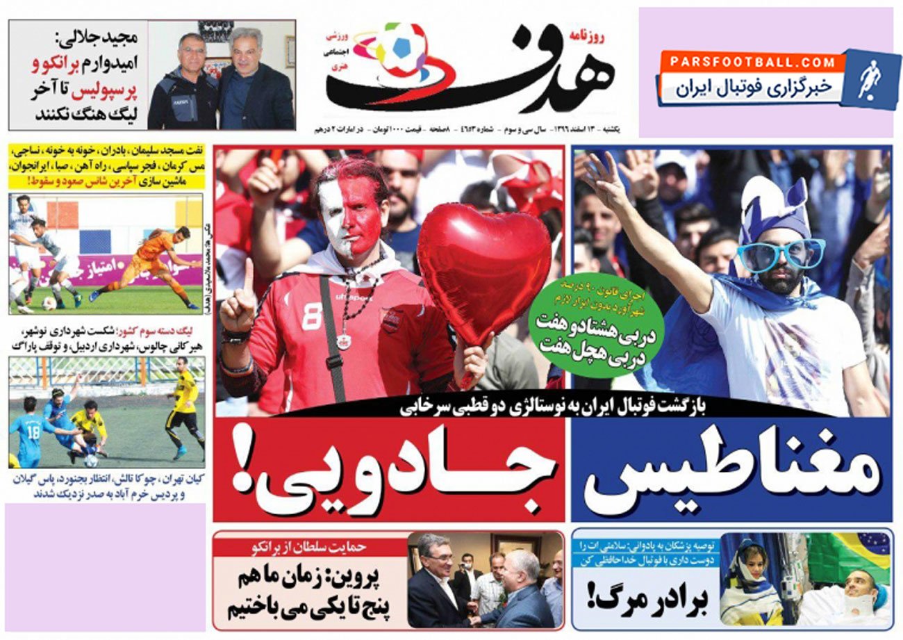 روزنامه هدف ورزشی ، یکشنبه ۱۳ اسفند ؛ دربی هشتاد و هفت ، دربی هچل هفت !