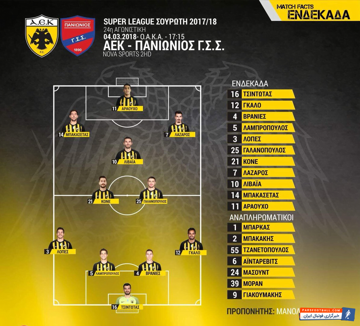 در ادامه ترکیب تیم فوتبال آ.اک یونان را برای جدال با پانیونیوس مشاهده می نمایید: