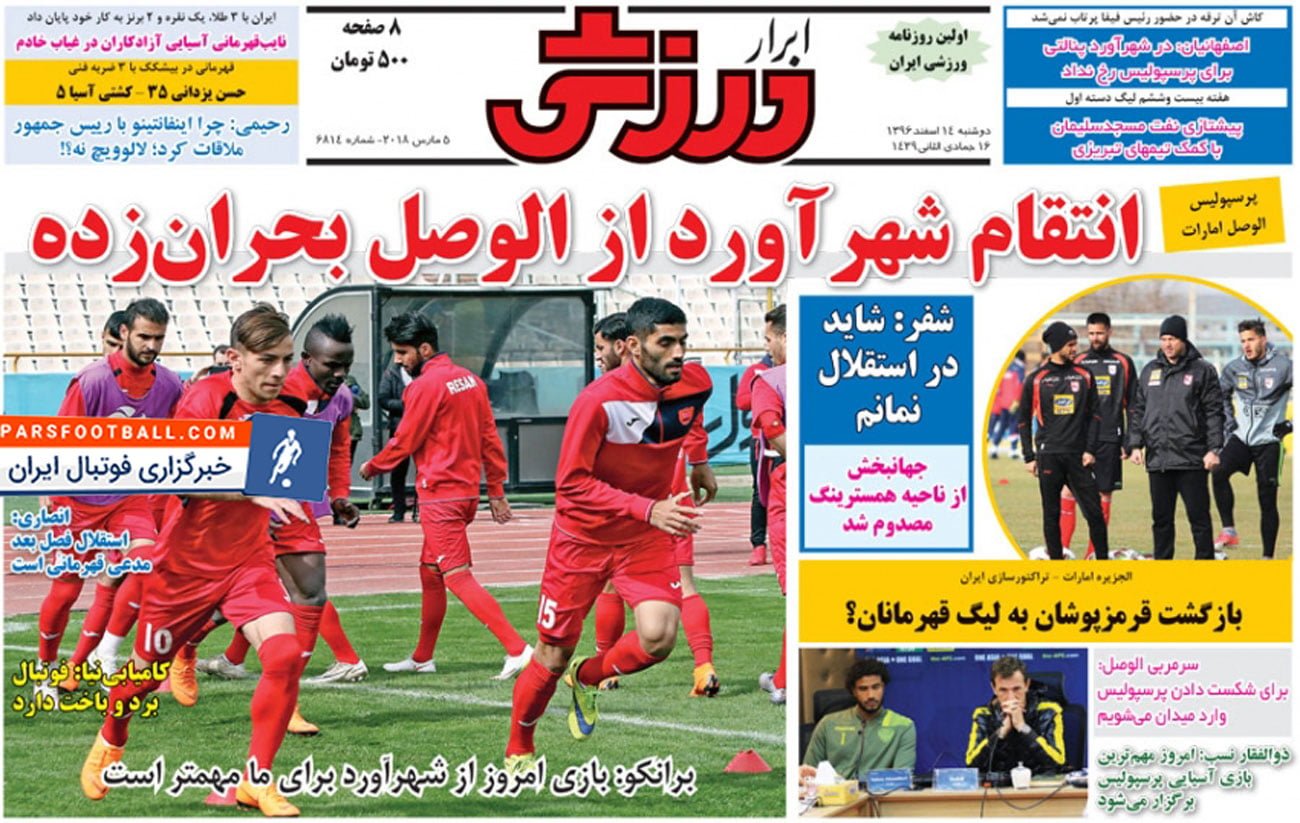 روزنامه ابرار ورزشی ، دوشنبه ۱۴ اسفند ؛ انتقام شهرآورد از الوصل بحران زده !