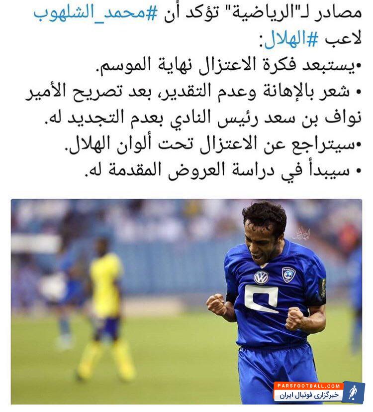 محمد شلهوب بازیکن باتجربه تیم الهلال عربستان که گفته می شد قصد دارد در پایان فصل از دنیای بازیگری فوتبال خداحافظی کند در مصاحبه ای این موضوع را رد کرد. یکروز بعد از اینکه مدیرعامل باشگاه الهلال در مصاحبه ای تلویزیونی اعلام کرد قرارداد شلهوب را تمدید نمی کند تا او فوتبالش به پایان برسد، این بازیکن عربستان واکنش تندی به این صحبت ها نشان داد.