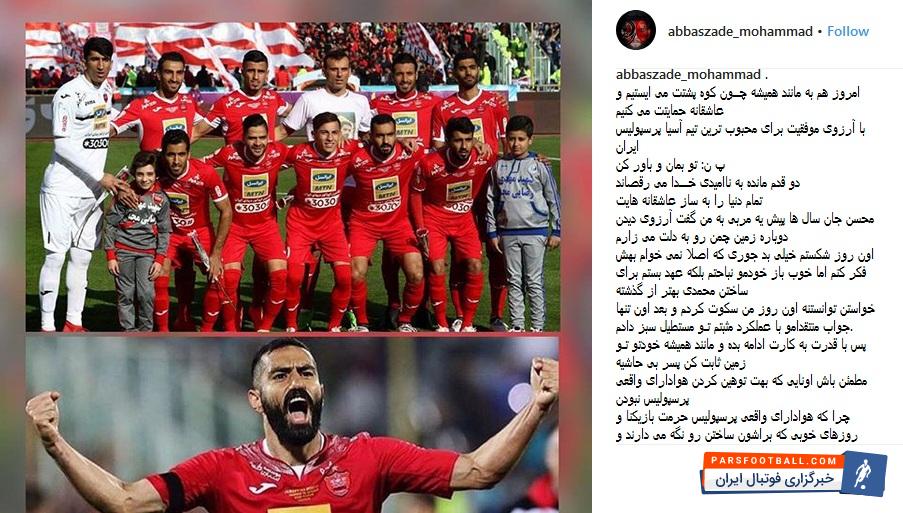 محسن جان سال ها پیش یه مربى به من گفت آرزوى دیدن دوباره زمین چمن رو به دلت مى زارم. اون روز شکستم خیلى بد جورى که اصلا نمى خوام بهش فکر کنم اما خوب باز خودمو نباحتم بلکه عهد بستم براى ساختن محمدى بهتر از گذشته. خواستن توانستنه اون روز من سکوت کردم و بعد اون تنها جواب منتقدامو با عملکرد مثبتم تـو مستطیل سبز دادم. پس با قدرت به کارت ادامه بده و مانند همیشه خودتو تـو زمین ثابت کن پسر بى حاشیه. مطمئن باش اونایى که بهت توهین کردن هواداراى واقعى پرسپولیس نبودن. چرا که هواداراى واقعى پرسپولیس حرمت بازیکنا و روزهاى خوبى که براشون ساختن رو نگه مى دارند و اونارو با یک یا دو اشتباه بازخواست نمى کنند. یا على بگو و محکم تـر بلند شو. خـــدا پشت و پناه خودت و خانواده گلت باشه داداش. همچنین خـــدا مادرتو بیامرزه و روحشون قرین رحمت الهى
