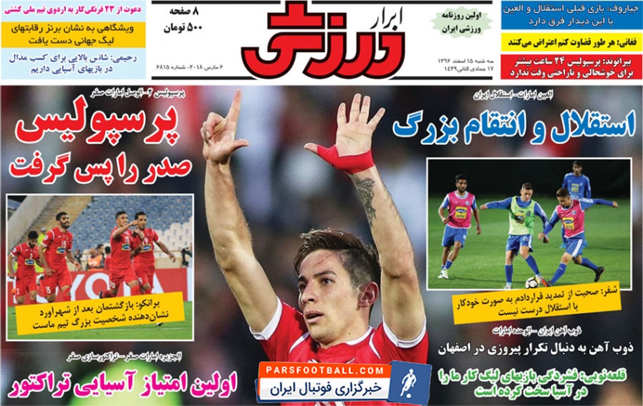 روزنامه ابرار ورزشی ، سهشنبه ۱۵ اسفند ؛ پرسپولیس صدر را پس گرفت !