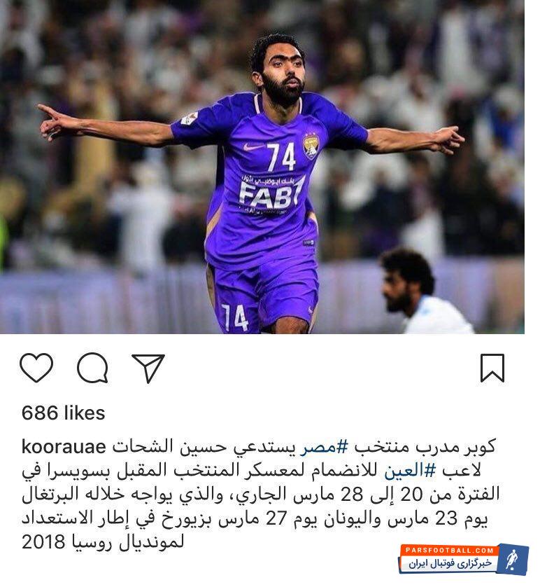 حسین شحات ستاره تیم العین برای بازی مقابل یونان و پرتغال به تیم ملی کشورش دعوت شده است.