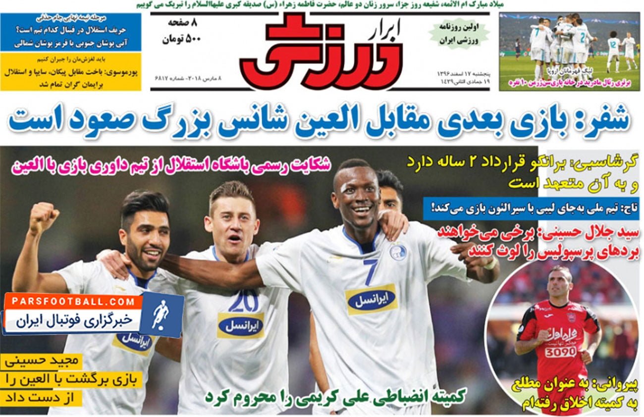 روزنامه ابرار ورزشی ، پنجشنبه ۱۷ اسفند ؛ برخی میخواهند بردهای پرسپولیس را لوث کنند !