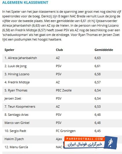 سایت مجله معتبر فوتبال هلند پس از پایان دیدارهای باقیمانده از هفته بیستونهم اردویژه در شب گذشته (یکشنبه) جدیدترین ردهبندی برترین بازیکنان فصل را با توجه به امتیازهای آنها منتشر کرد که در آن علیرضا جهانبخش از تیم آلکمار همچنان به صدرنشینی خود ادامه داد.