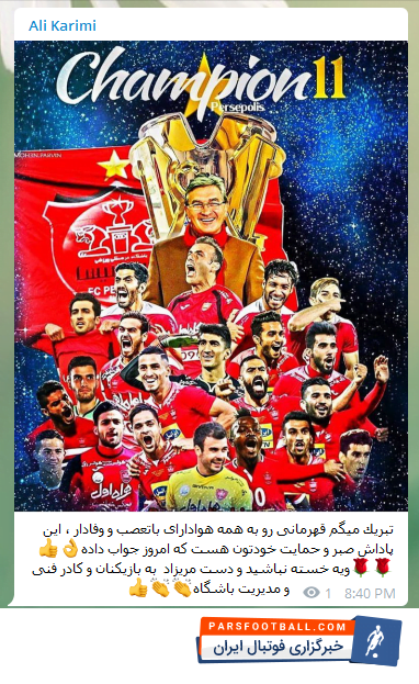 عکس ؛ تبریک تلگرامی علی کریمی به پرسپولیسی ها