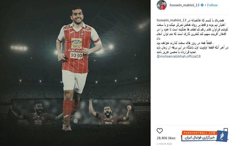 حسین ماهینی هم تیمی محسن ربیع خواه در صفحه اینستاگرام خود نسبت به مصدومیت شدید محسن ربیع خواه واکنش نشان داد و از مسئولان این تیم درخواست کرد با این بازیکن تمدید قرارداد کنند.