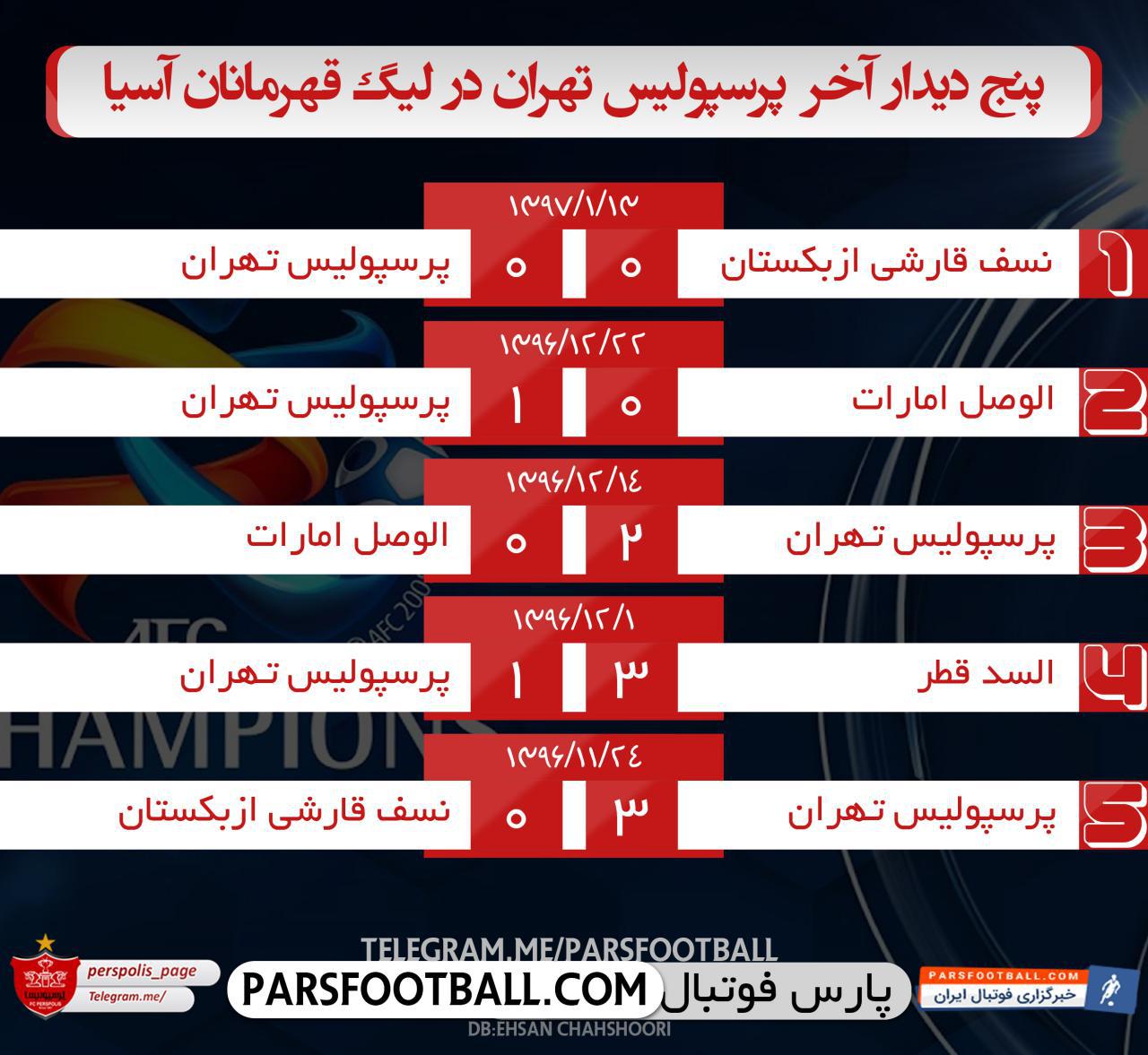 در ادامه نیز اینفوگرافی آمار پنج دیدار آخر پرسپولیس در لیگ قهرمانان آسیا را برای شما آماده کرده ایم: