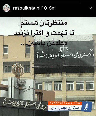 صحبت های این سرمربی با اینکه بدون ذکر نام بود اما با توجه به کدهایی که در متن آن نهفته شده بود فرد مورد نظر را به خوبی معرفی می کرد. در همین رابطه رسول خطیبی سرمربی سابق ماشین سازی که طبق متن مصاحبه فوق به او اتهام زده شده بود امروز با حضور در دادگسترش کل استان آذربایجان شرقی از سرمربی تیم دسته یکی شکایت کرد. خطیبی پس از شکایت از این سرمربی استوری فوق را در اینستاگرامش منشتر کرده و نوشت: