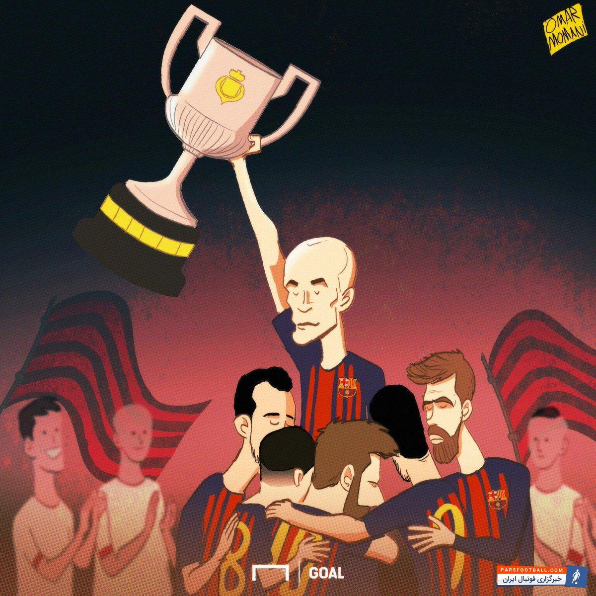 بارسلونا شب گذشته موفق شد با پنج گل، سویا را در هم کوبیده و برای سی امین بار قهرمان کوپا دل ری شود. این بازی تحت تاثیر خداحافظی قریب الوقوع آندرس اینیستا از بارسلونا قرار داشت و از واکنش بازیکنان و هواداران نسبت به تعویض او مشخص بود که زمان جدایی فرا رسیده است. عمر مومنی با کاریکاتور زیر به هر دو اتفاق واکنش نشان داده است: