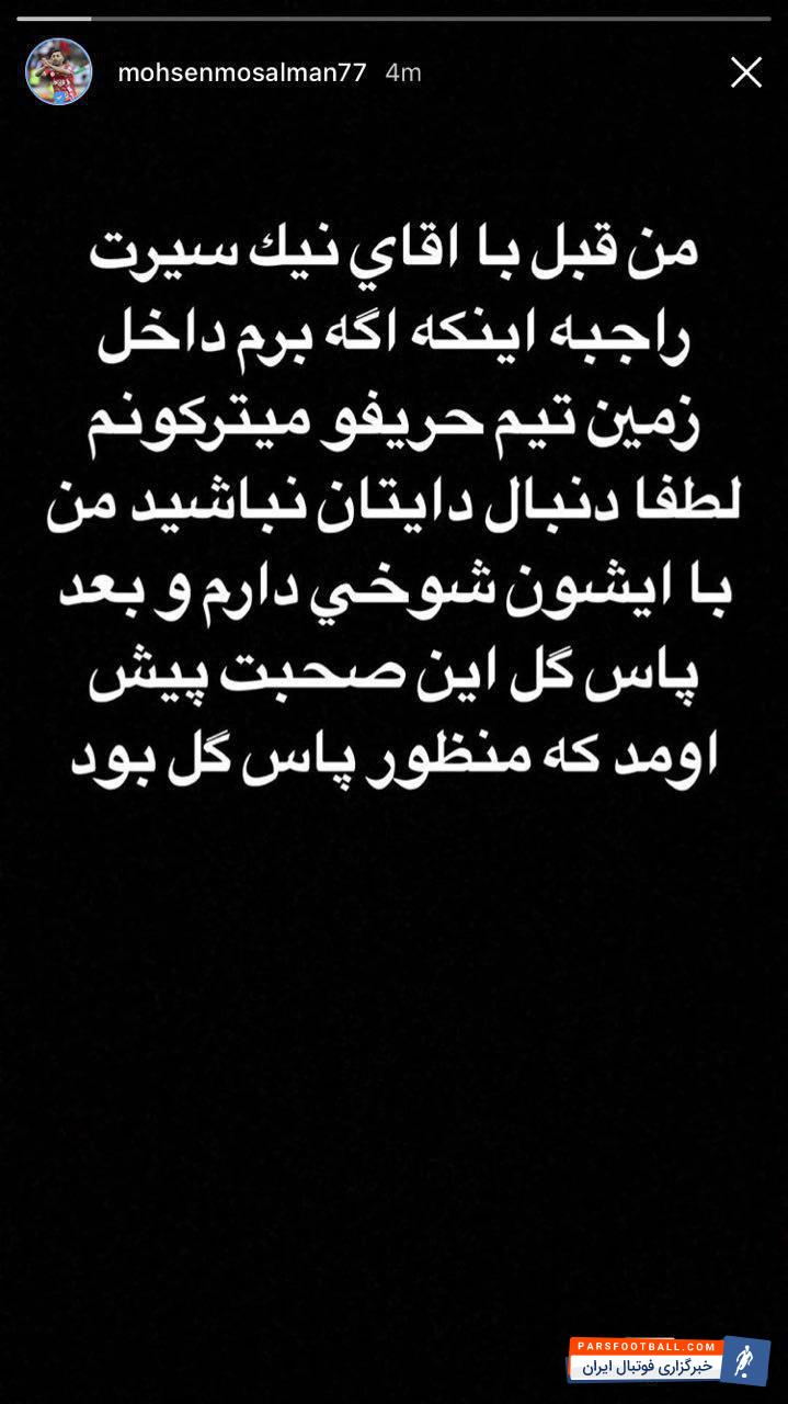 پس از این اتفاق و آغاز حاشیه علیه مسـلمان و نیک سیرت، محسن مسـلمان در اینستاگرام خود پست زیر را منتشر کرد: