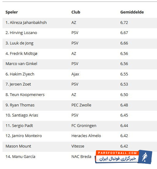 با اتمام هفته سی و سوم رقابت های لیگ برتر هلند، روزنامه بین المللی فوتبال هلند مثل همیشه رده بندی بهترین های فصل ۲۰۱۷-۲۰۱۸ لیگ هلند را اعلام کرد که علیرضا جهانبخش ، هافبک ملی پوش کشورمان با کسب امتیاز ۶.۷۲ کماکان در صدر بهترین ها قرار دارد.