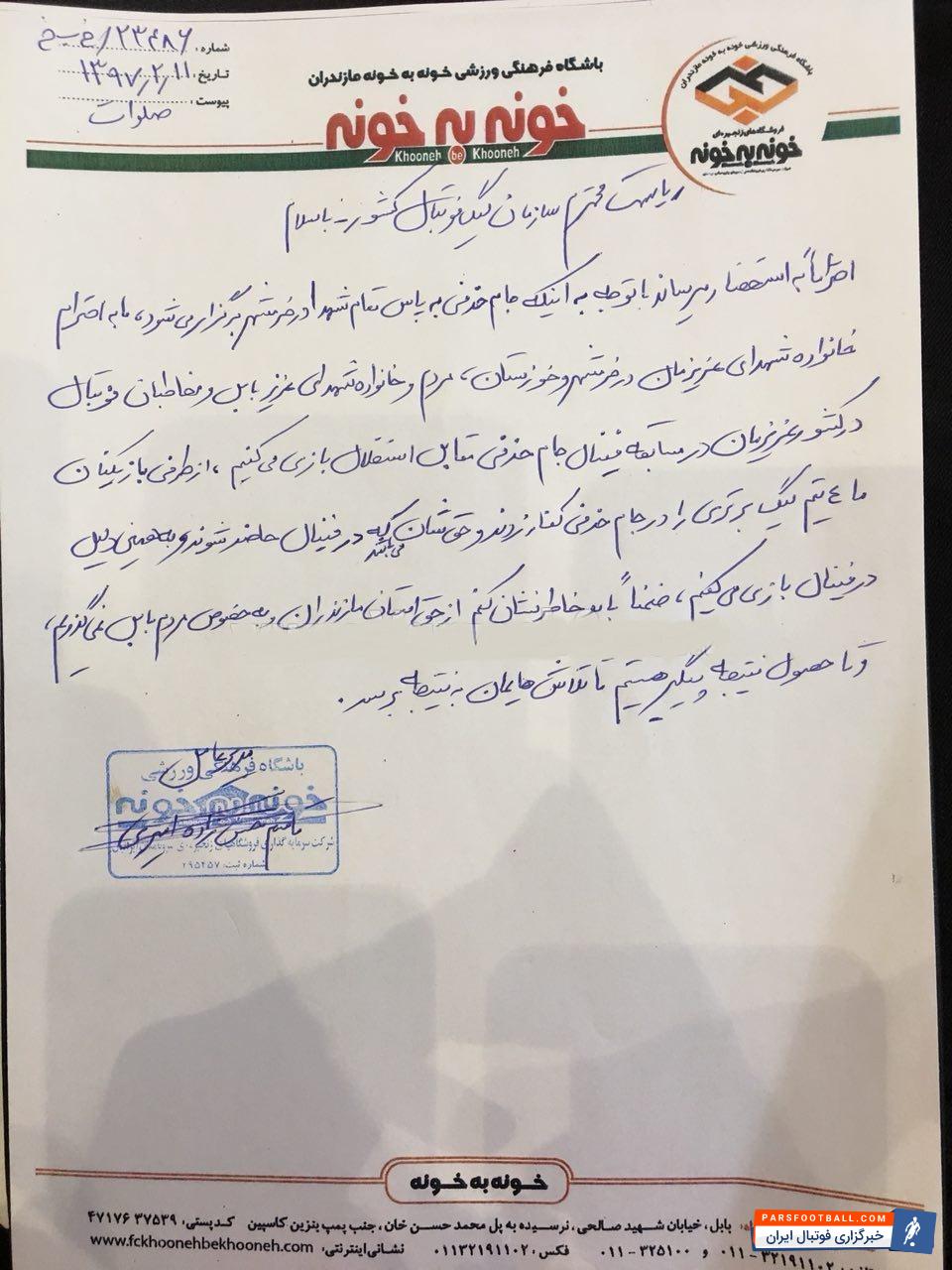 نامه رسمی خونه به خونه برای حضور در فینال حذفی