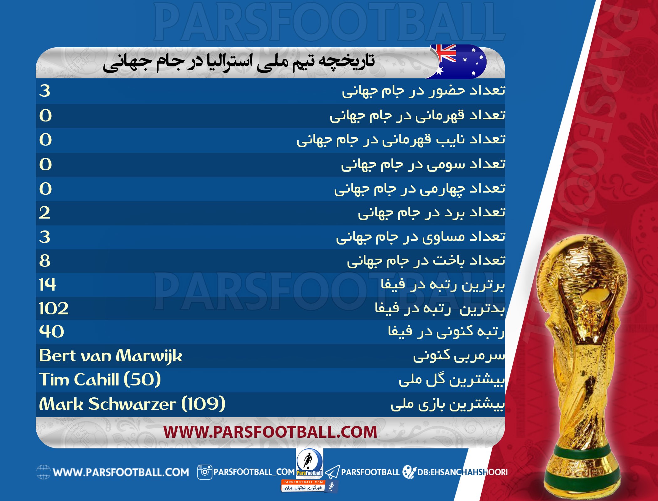 در آستانه ی جام جهانی 2018 روسیه، خبرگزاری پارس فوتبال اینفوگرافی آمار و عملکرد تیم ملی فوتبال استرالیا در ادوار جام های جهانی را برای شما آماده کرده است: