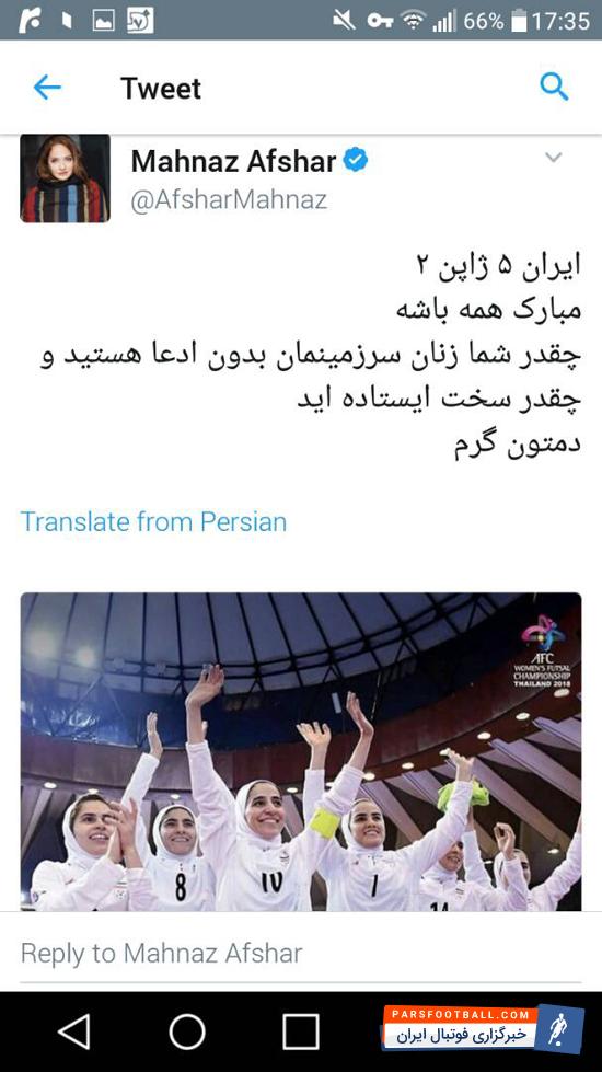 پس از این اتفاق مهناز افشار برد تیم ملی فوتسال بانوان ایران را تبریک گفت.