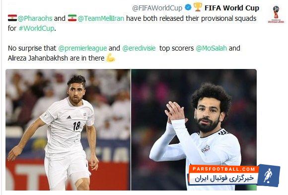 حساب رسمی توئیتر فیفا به حضور علیرضا جهانبخش و محمد صلاح در تیمهای ملی ایران و مصر واکنش نشان داد.