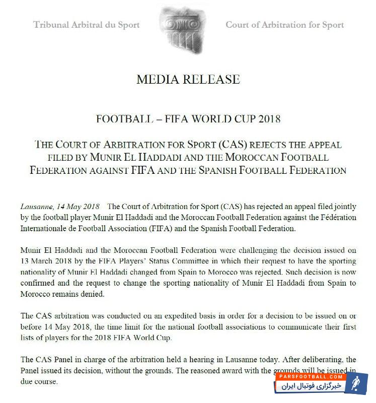 مونیر الحدادی به دلیل همین بازی کمتر از ۱۵ دقیقه برای تیم ملی اسپانیا، طی ماههای اخیر به همراه فدراسیون فوتبال مراکش مکاتبات زیادی با فیفا داشت تا بتواند در جام جهانی ۲۰۱۸ برای مراکش به میدان برود ولی بعد از ماهها پیگیری، امروز دادگاه CAS رای نهایی راجع به این موضوع را صادر کرد و خلاف مطابق میل مراکشیها رای داد.