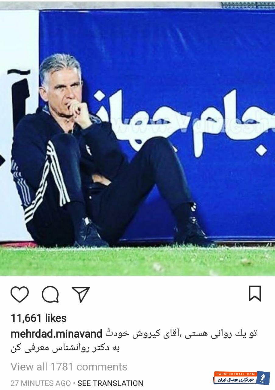 مهرداد میناوند در صفحه اینستاگرام خود خطاب به کارلوس کی روش نوشت: تو یک روانی هستی.