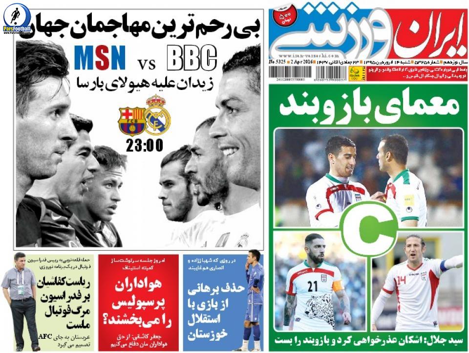 نگاهی داریم بر نیم صفحه نخست روزنامه ایران ورزشی، شنبه ۱۴ فروردین.