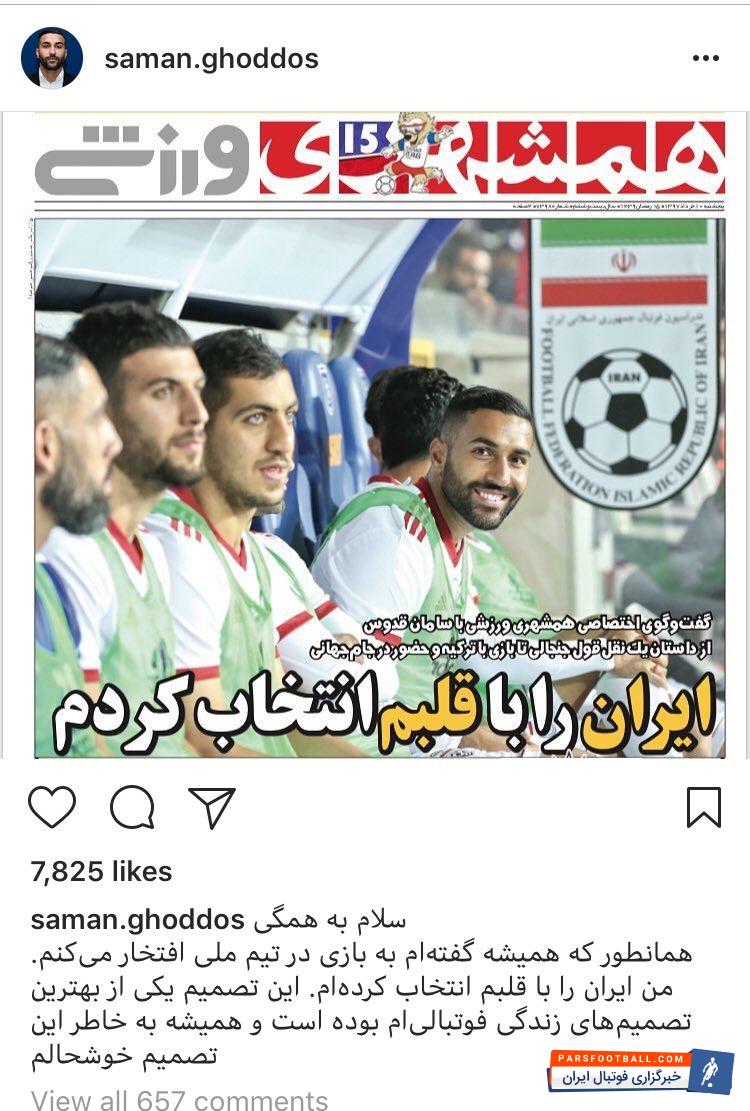 عکس ؛ پست معنادار “سامان قدوس” پس از شایعات مربوط به پشیمانی او از انتخاب تیم ملی ایران به جای سوئد