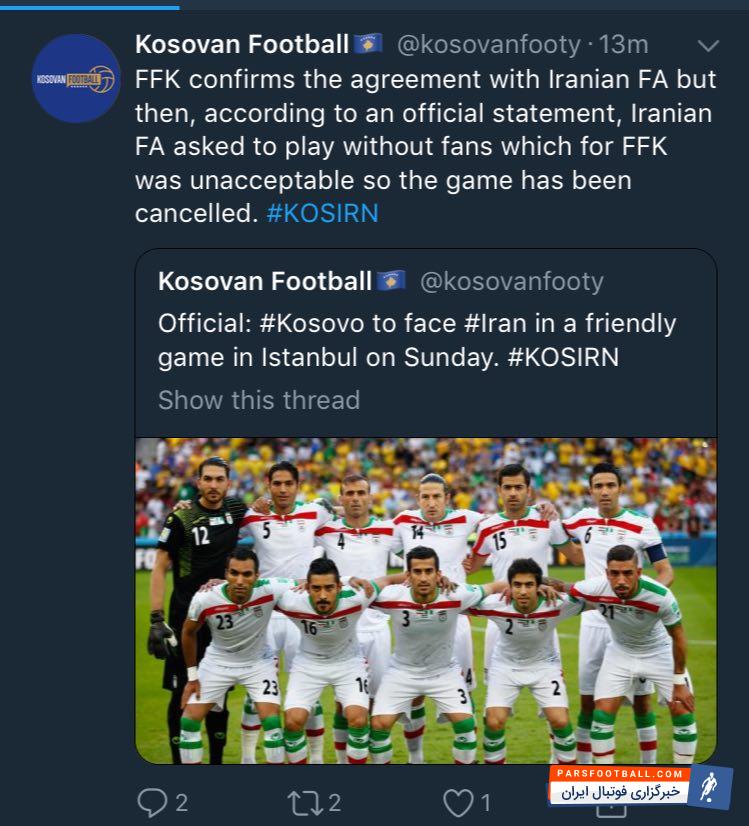 صبح پنجشنبه خبر برگزاری دیدار دوستانه میان تیم های ملی کوزوو و ایران منتشر شد، پس از شرایط فدراسیون فوتبال برای برگزار شدن این دیدار پشت درهای بسته، فدراسیون فوتبال کوزوو با درخواست فدراسیون فوتبال ایران مخالفت کرد تا برگزاری این دیدار لغو شود.