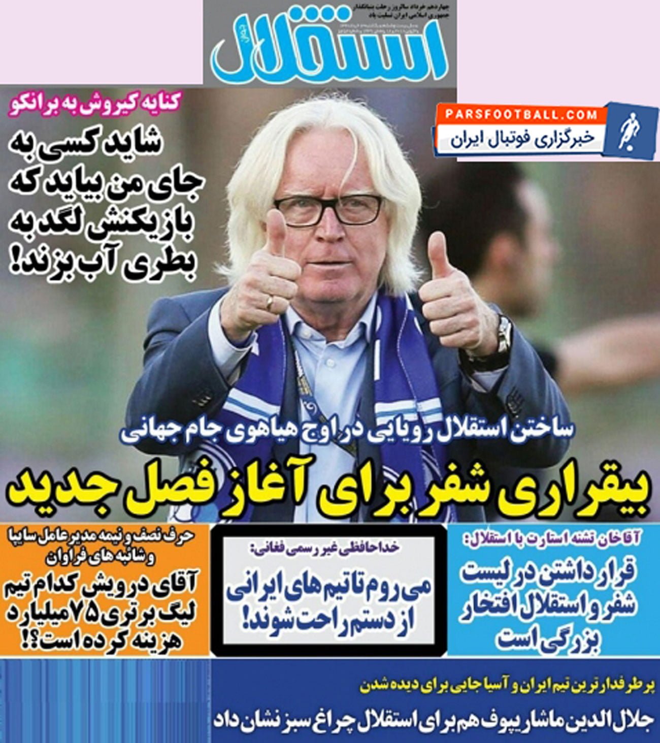 روزنامه استقلال جوان ، یکشنبه ۱۳ خرداد ؛ بی قراری شفر برای آغاز فصل جدید !