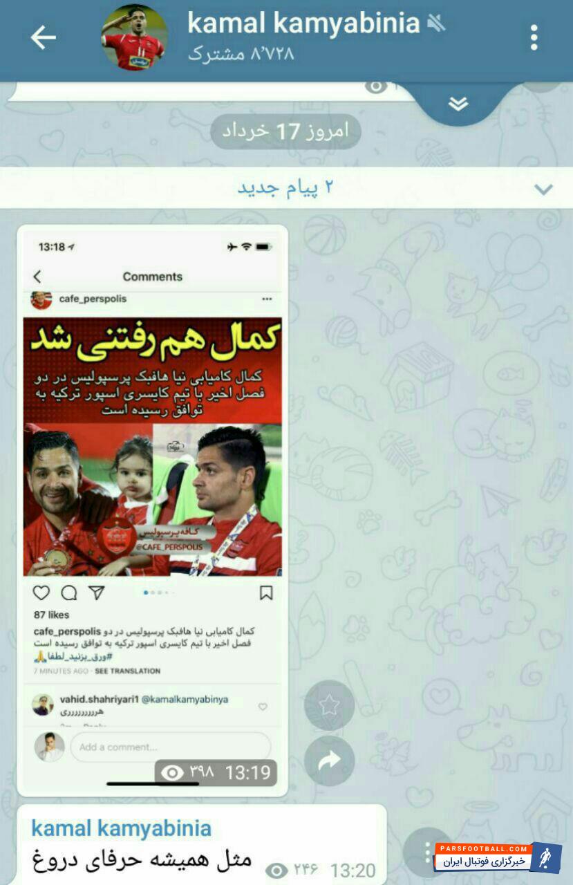 کمال کامیابی نیا بازیکن فصل گذشته تیم فوتبال پرسپولیس که هنوز قراردادش را با این باشگاه تمدید نکرده است به خبر توافقش با باشگاه ترکیه ای کایسری اسپور که در بعضی از خبرگزاری های ورزشی منتشر شده بود از طریق کانال تلگرامی اش واکنش نشان داد و این خبر را رد کرد.