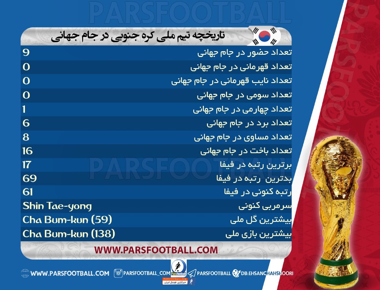 در آستانه ی جام جهانی 2018 روسیه، خبرگزاری پارس فوتبال اینفوگرافی آمار و عملکرد تیم ملی فوتبال کره جنوبی در ادوار جام های جهانی را برای شما آماده کرده است: