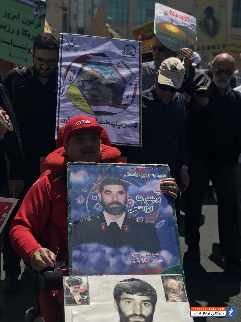 عمو موسـی سلامت جانباز پرسپولیسی که یکی از هواداران شش آتیشه و وفادار باشگاه فوتبال پرسپولیس است در راهپیمایی روز قدس حاضر شد.