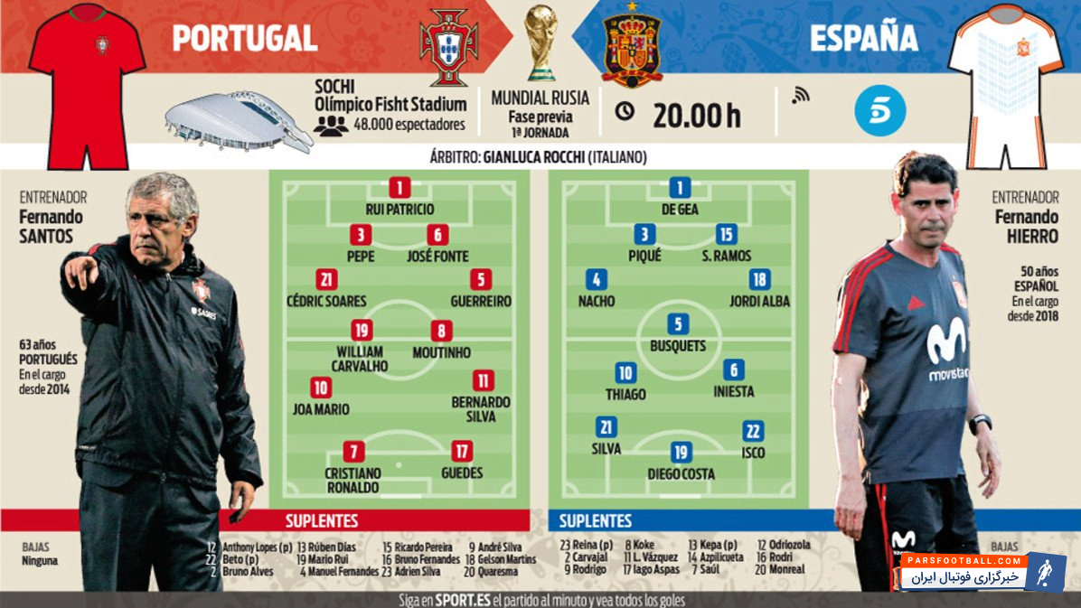 امشب (جمعه) در دومین دیدار گروه B جام جهانی روسیه از ساعت ۲۲:۳۰ دقیقه اسپانیا و پرتغال به مصاف هم خواهند رفت و ترکیب احتمالی بازیکنان این دو تیم اعلام شد.