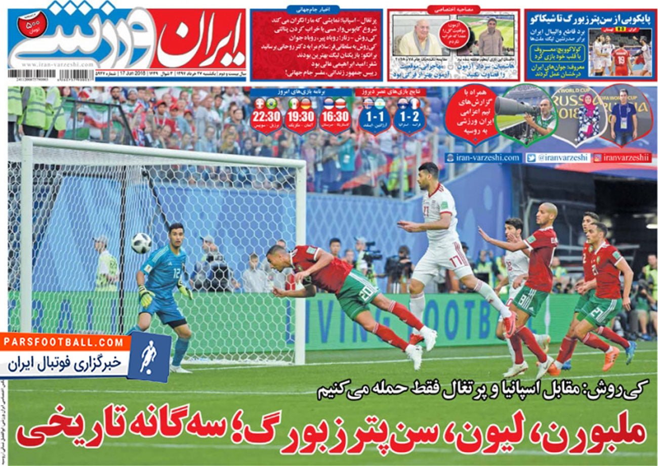 روزنامه ایران ورزشی ، یکشنبه ۲۷ خرداد ؛ مقابل اسپانیا و پرتغال فقط حمله می کنیم !