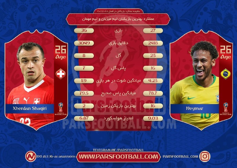 به مناسبت دیدار تیم های برزیل و سوئیس در بازی های جام جهانی ۲۰۱۸ روسیه ۲۷ خرداد ۹۷، در یک اینفوگرافی، عملکرد دو ستاره ی این تیم ها را مورد بررسی قرار داده ایم: