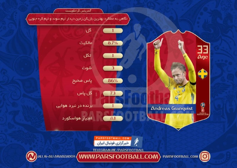 پس از پایان بازی تیم های سوئد و کره جنوبی در بازی های گروه F جام جهانی 2018 روسیه ۲۸ خرداد ۹۷ که این بازی با برتری ۱-۰ سوئد به پایان رسید، آندریاس گرانکوئیست به عنوان بهترین بازیکن زمین انتخاب شد که در یک اینفوگرافی به آمار این بازیکن پرداخته ایم: