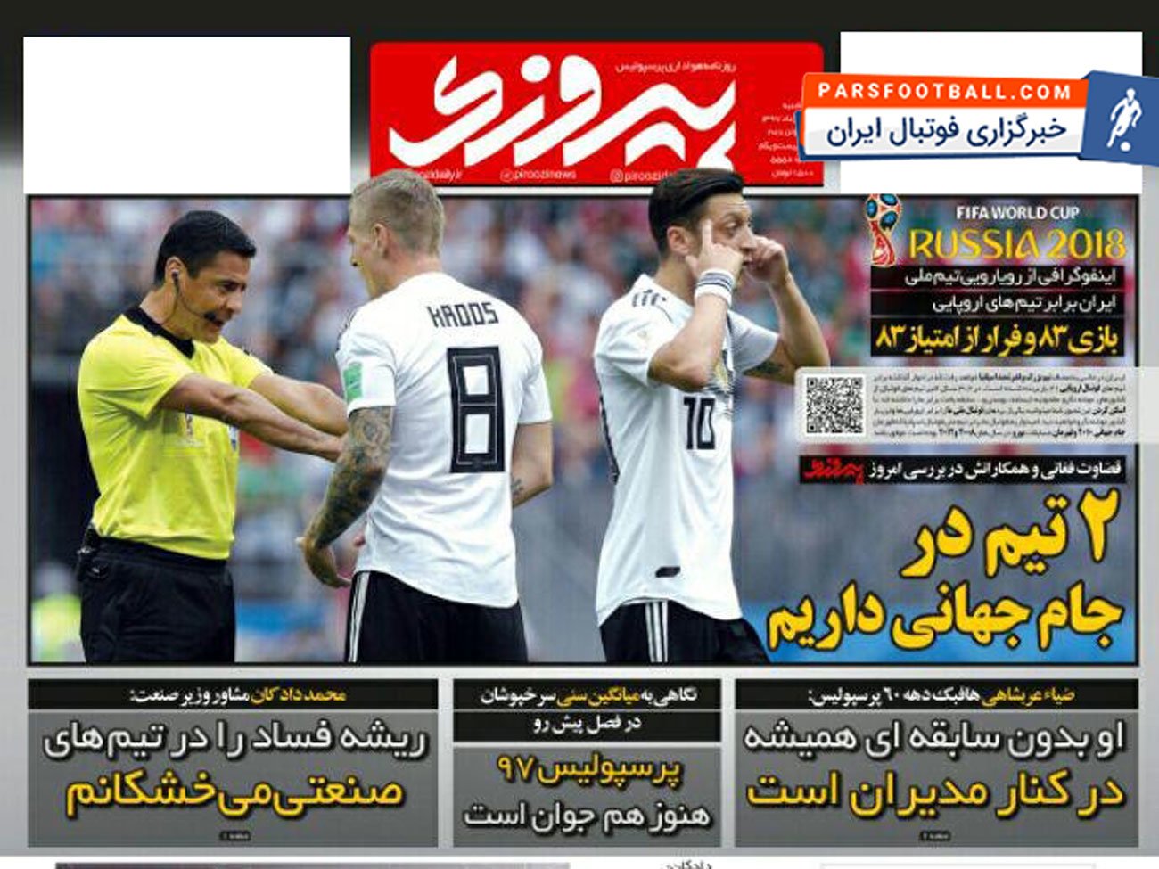 روزنامه پیروزی ، سهشنبه ۲۹ خرداد ؛ ۲ تیم در جام جهانی داریم !