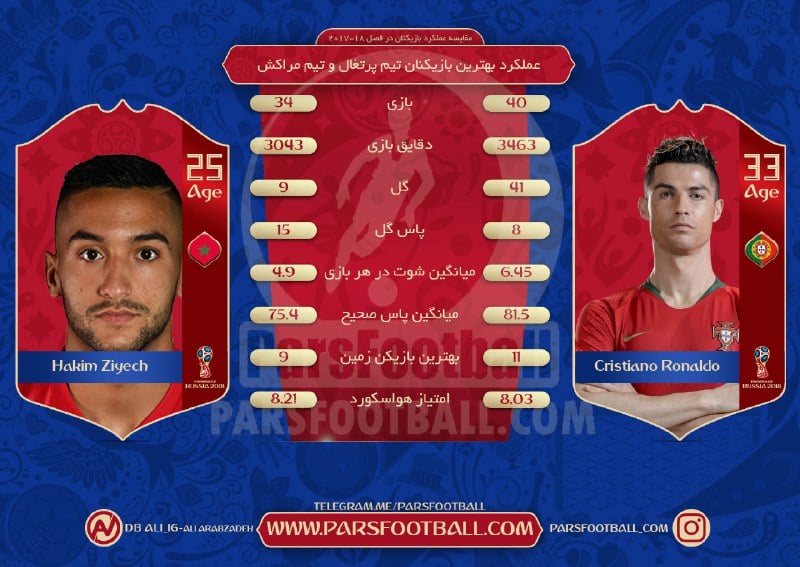 به مناسبت دیدار تیم های پرتغال و مراکش از بازی های گروه B جام جهانی ۲۰۱۸ روسیه ۳۰ خرداد ۹۷، در یک اینفوگرافی به آمار و ارقام کریستیانو رونالدو و حکیم زیاش، بهترین بازیکنان دو تیم پرداخته ایم: