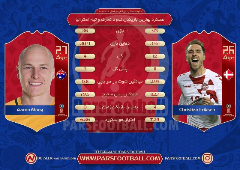 به مناسبت دیدار تیم های دانمارک و استرالیا در بازی های گروه C جام جهانی ۲۰۱۸ روسیه ۳۱ خرداد ۹۷، آمار و عملکرد کریستین اریکسن و آرون موی، بهترین بازیکنان دو تیم را مورد بررسی قرار داده ایم: