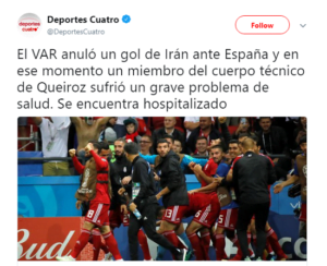 گل ایران با تکنولوژی بازبینی صحنه مردود اعلام شده و بعد از آن یکی از اعضای کادر فنی تیم ملی، ایران دچار مشکلی جدی از لحاظ سلامتی شده یا راهی بیمارستان شد.