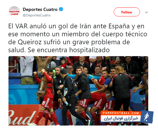 گل ایران با تکنولوژی بازبینی صحنه مردود اعلام شده و بعد از آن یکی از اعضای کادر فنی تیم ملی، ایران دچار مشکلی جدی از لحاظ سلامتی شده یا راهی بیمارستان شد.